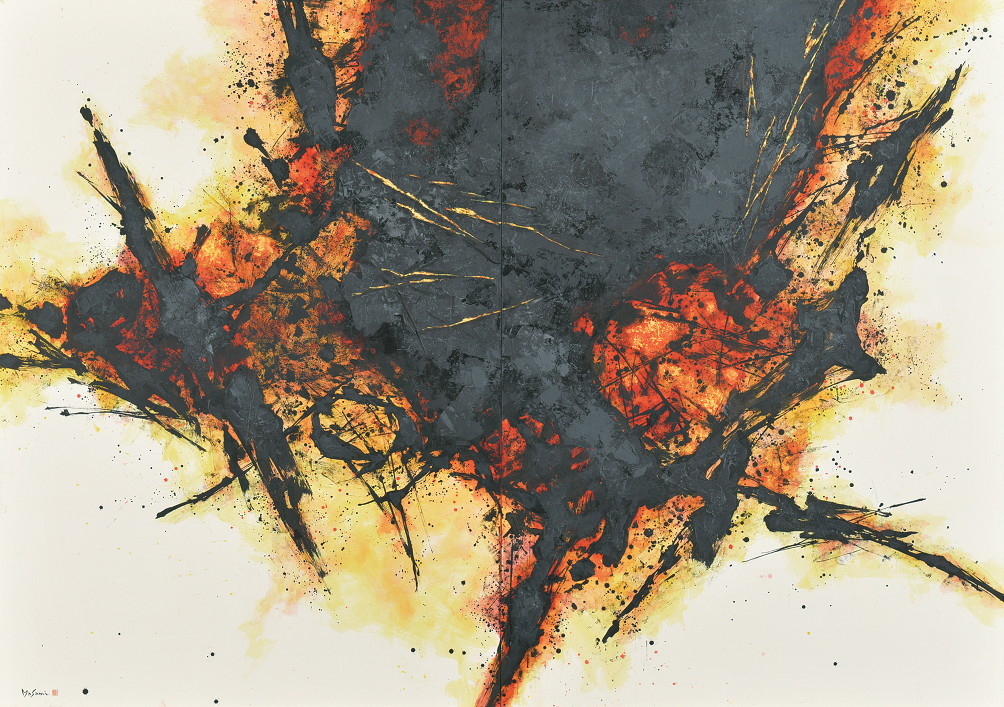 「壊れかけた太陽」 和紙・アクリル・墨 162×324㎝ 2020年 作品番号1-38 |